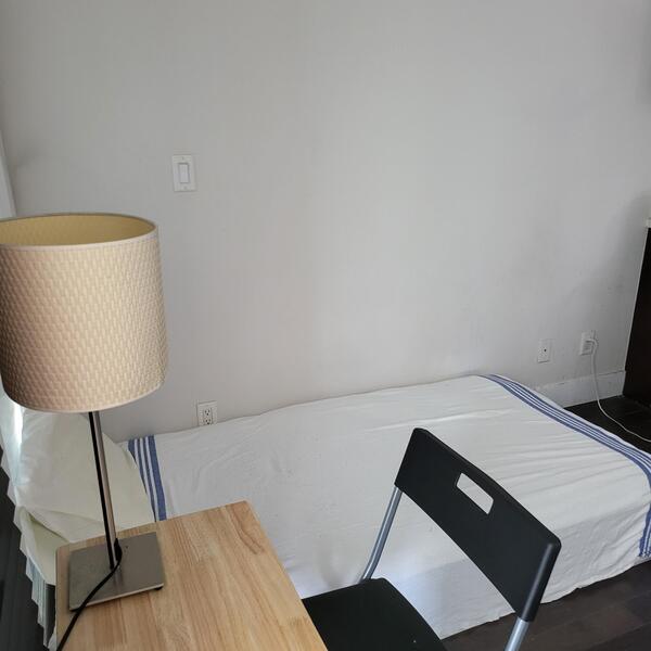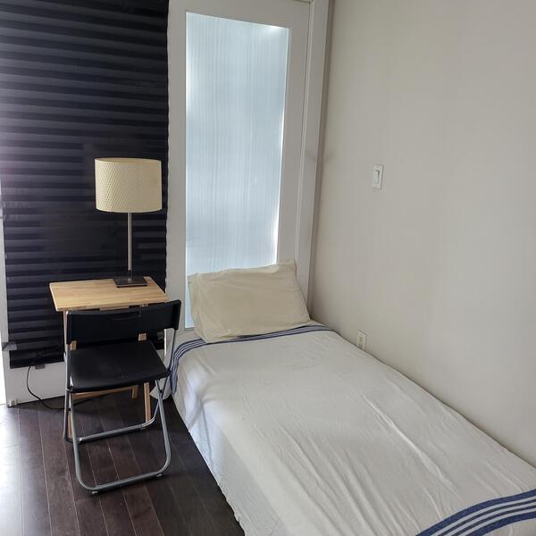 貸すお部屋はリビングですが、パーティションで仕切られているので外からは見えない形になっており、過去に住んでいた方達にはとても気に入っていただけました。寝る時に他の部屋の明るさで寝れないということも無く、お部屋にベッドと寝具一式、デスク&チェア、ハンガーラック、箪笥等があります。勉強なども不自由なくできます。プライバシーも十分に確保できるので安心して住んでいだたけると思います。中央図書館徒歩1分で行けます。